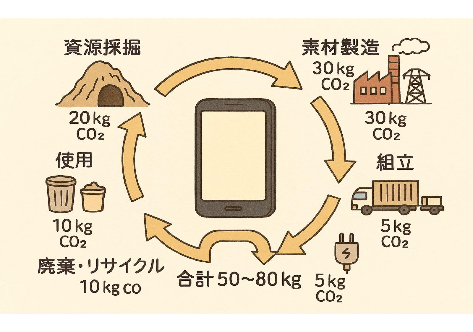 LCAを行うと、スマホ1台あたりの製造段階のCO₂排出量は、おおよそ50〜80kgに達すると言われます。