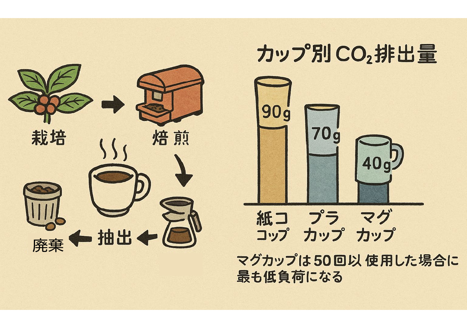 LCAでは、1杯(約200mL)のコーヒーが地球に与える影響を、栽培・輸送・焙煎・抽出・廃棄まで追いかけます。