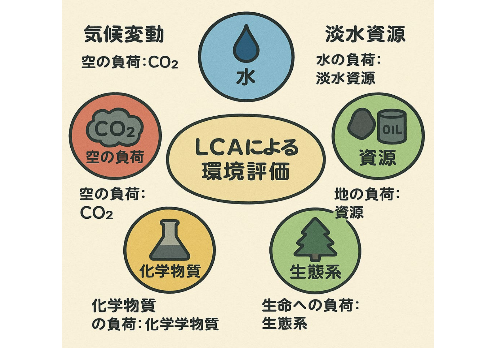 多くの人がまず思い浮かべるのは「CO₂排出量」ですが、LCAが見ているのはそれだけではありません。